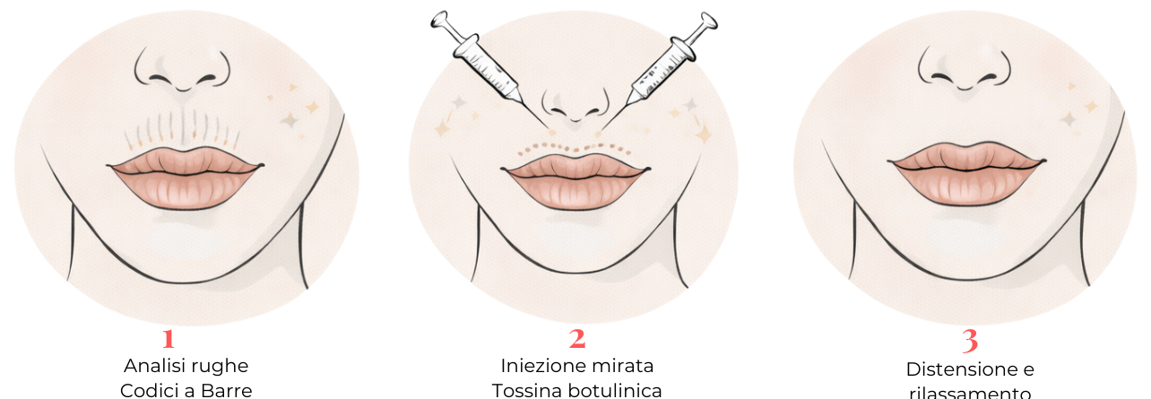 Si procede poi con micro-iniezioni di tossina botulinica nei muscoli responsabili della contrazione delle labbra. Il trattamento è rapido, ben tollerato e praticamente indolore, motivo per cui non è generalmente richiesta anestesia.