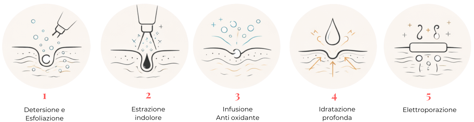 Segue la fase di estrazione indolore, in cui l’aspirazione mirata consente di eliminare comedoni e punti neri senza stressare la pelle.