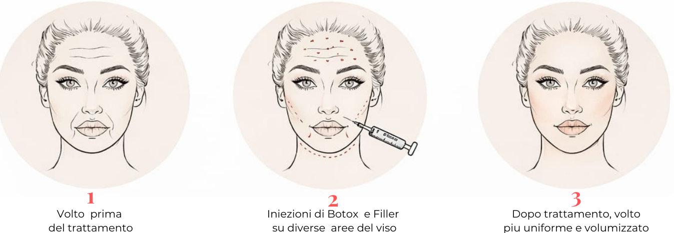 In base al tipo di filler utilizzato, i risultati possono mantenersi da 6 fino a 12 mesi, mentre l’effetto dei miorilassanti ha una durata media di circa 3 mesi. Quando i benefici iniziano ad attenuarsi, è possibile prenotare una visita di controllo per valutare eventuali ritocchi o trattamenti di mantenimento.