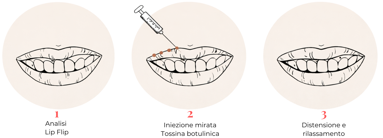 Il trattamento agisce rilassando temporaneamente i muscoli periorali, evitando che il labbro superiore venga tirato verso il basso.