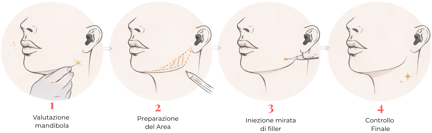 Viene poi effettuato un micro-accesso con un ago sottile per creare l’ingresso nella zona mandibolare; il filler viene successivamente posizionato attraverso una cannula, uno strumento a punta smussa che consente una distribuzione precisa e sicura del prodotto.