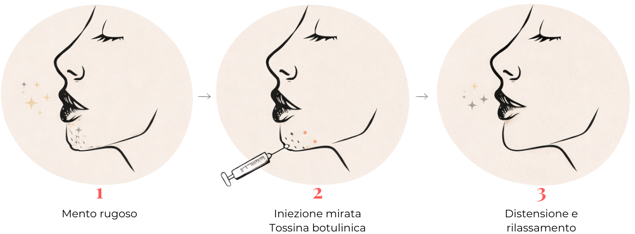 La procedura è rapida, dura generalmente pochi minuti e comporta solo lievi sensazioni di puntura. Dopo le iniezioni, il miorilassante inibisce la trasmissione degli impulsi nervosi ai muscoli del mento, favorendone il rilassamento e contribuendo alla riduzione di rughe e fossette.