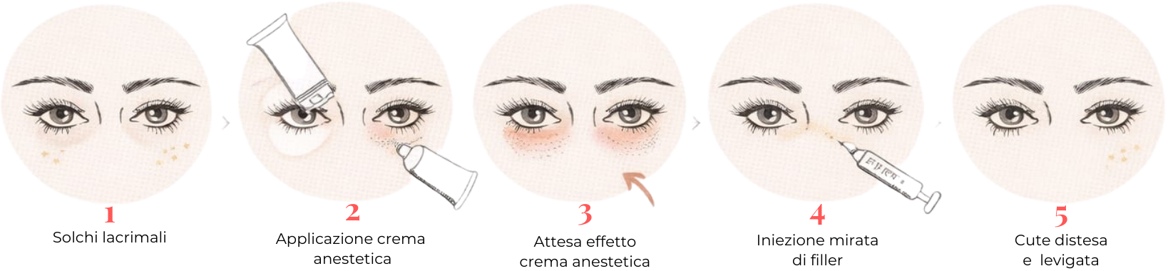 Durante la consulenza iniziale, il medico approfondisce obiettivi ed aspettative, elementi fondamentali per stabilire quale tipo di filler per il solco lacrimale sia più indicato per l’area sotto gli occhi. Se richiesto, può essere applicata una crema anestetica per aumentare il comfort durante la procedura. Una volta ottenuto l’effetto anestetico, il trattamento può avere inizio. Oltre a correggere il solco lacrimale, i filler contribuiscono anche a migliorare l’aspetto delle occhiaie.